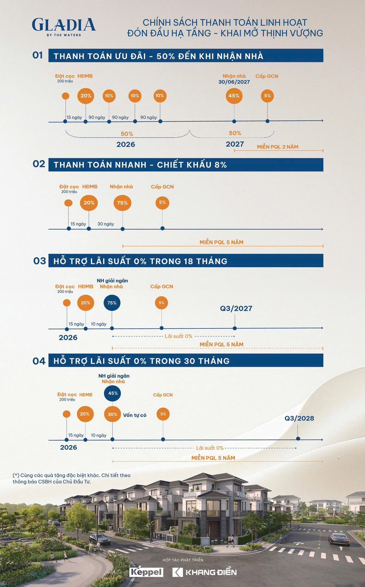 Ngày 25/01/2026, liên doanh Keppel – Khang Điền tổ chức lễ bàn giao sổ hồng cho khách hàng tại phân khu thấp tầng dự án Gladia by the Waters, đồng thời động thổ phân khu cao tầng với quy mô hơn 600 căn hộ, dự kiến bàn giao vào cuối năm 2027.