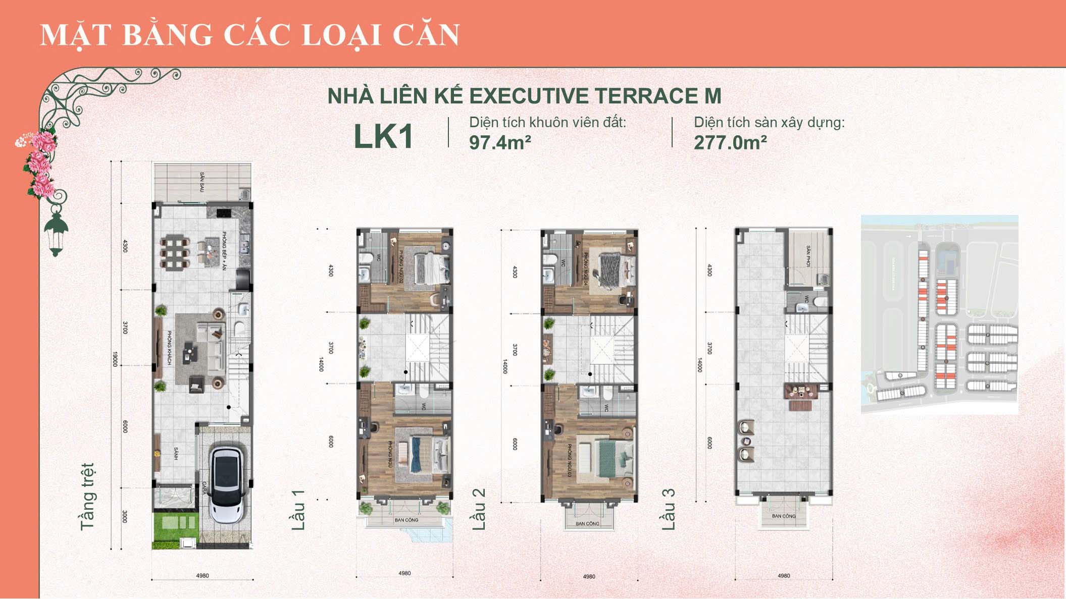 – Diện tích XD: 277 m2 ( 1 trệt, 3 lầu)