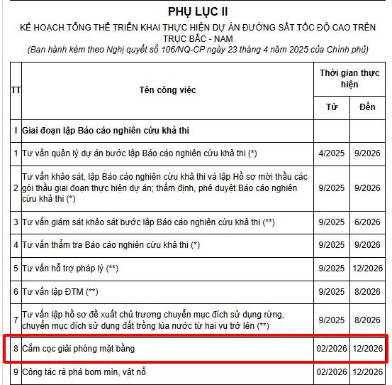 Như vậy, theo căn cứ nêu trên thì việc thực hiện cắm cọc giải phóng mặt bằng Dự án đường sắt cao tốc Bắc Nam sẽ bắt đầu từ tháng 2 năm 2026 và kết thúc vào tháng 12 năm 2026.