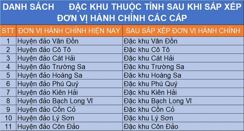 Cụ thể, cả nước sẽ có 11 đặc khu được thành lập tại các huyện đảo: Vân Đồn, Cô Tô, Cát Hải, Trường Sa, Hoàng Sa, Phú Quý, Kiên Hải, Bạch Long Vĩ, Cồn Cỏ, Lý Sơn và Côn Đảo.
