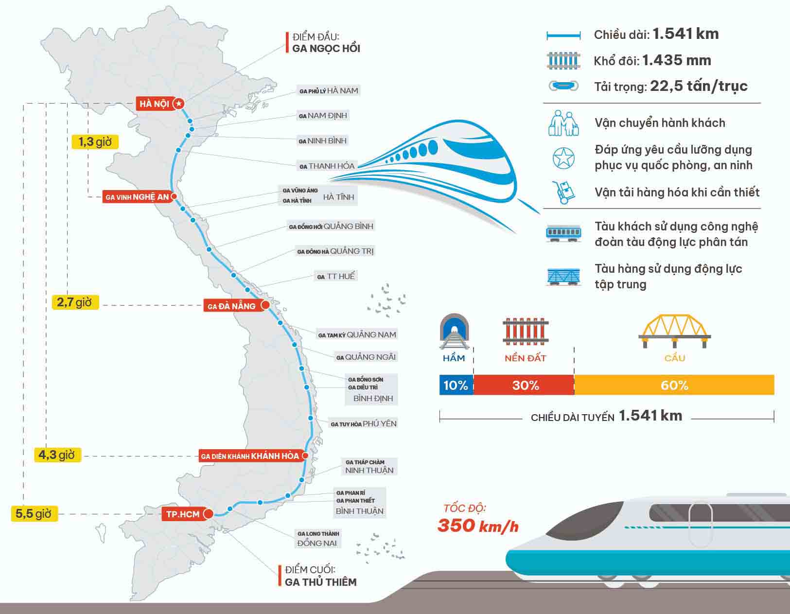 Dự án Đường sắt tốc độ cao trên trục Bắc – Nam có chiều dài khoảng 1.541km, có điểm đầu tư ga Ngọc Hồi (TP. Hà Nội) và kết thúc tại ga Thủ Thiêm (TP. HCM), đi qua địa phận của 20 tỉnh/thành phố.